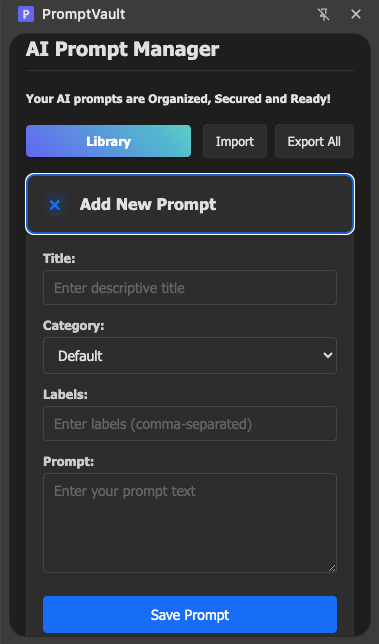 PromptVault is a browser extension that lets you save, organize, and reuse your favorite AI prompts. It works with tools like ChatGPT, Gemini, Claude, and more.